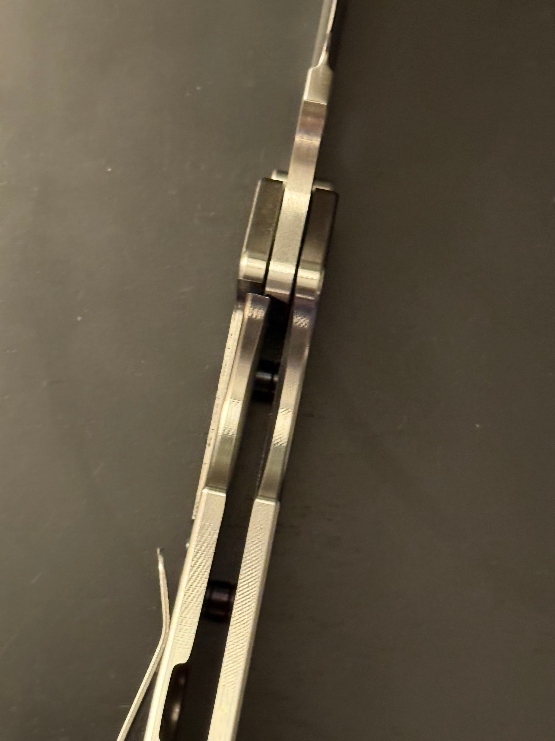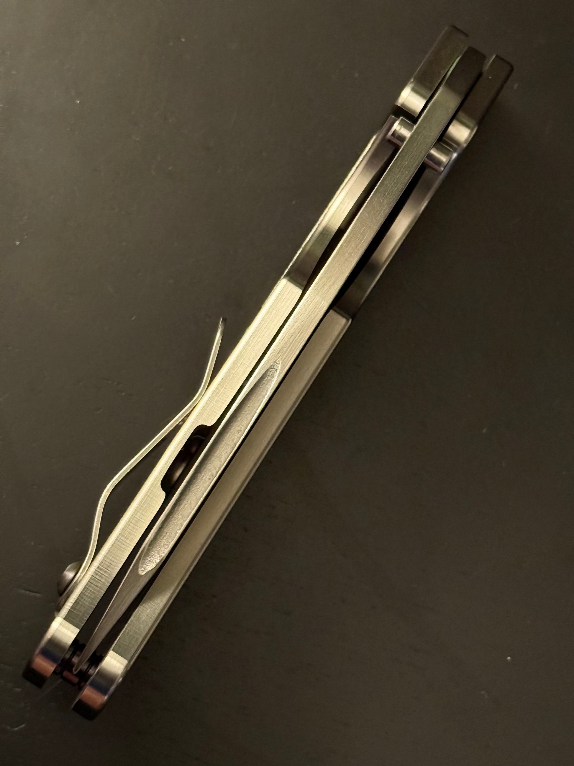 the blade is a Tanto in Magnacut steel with gunmetal satin finish