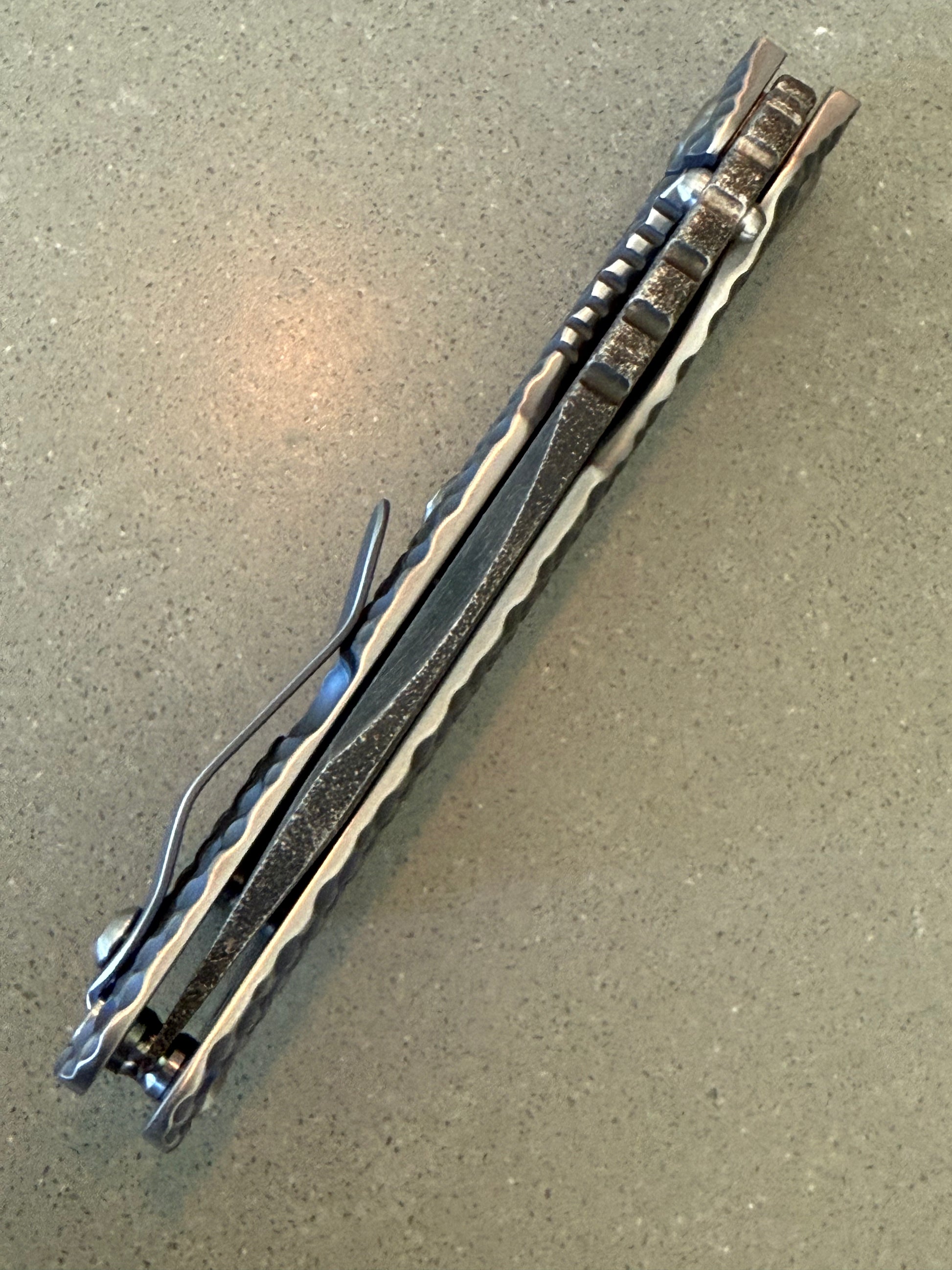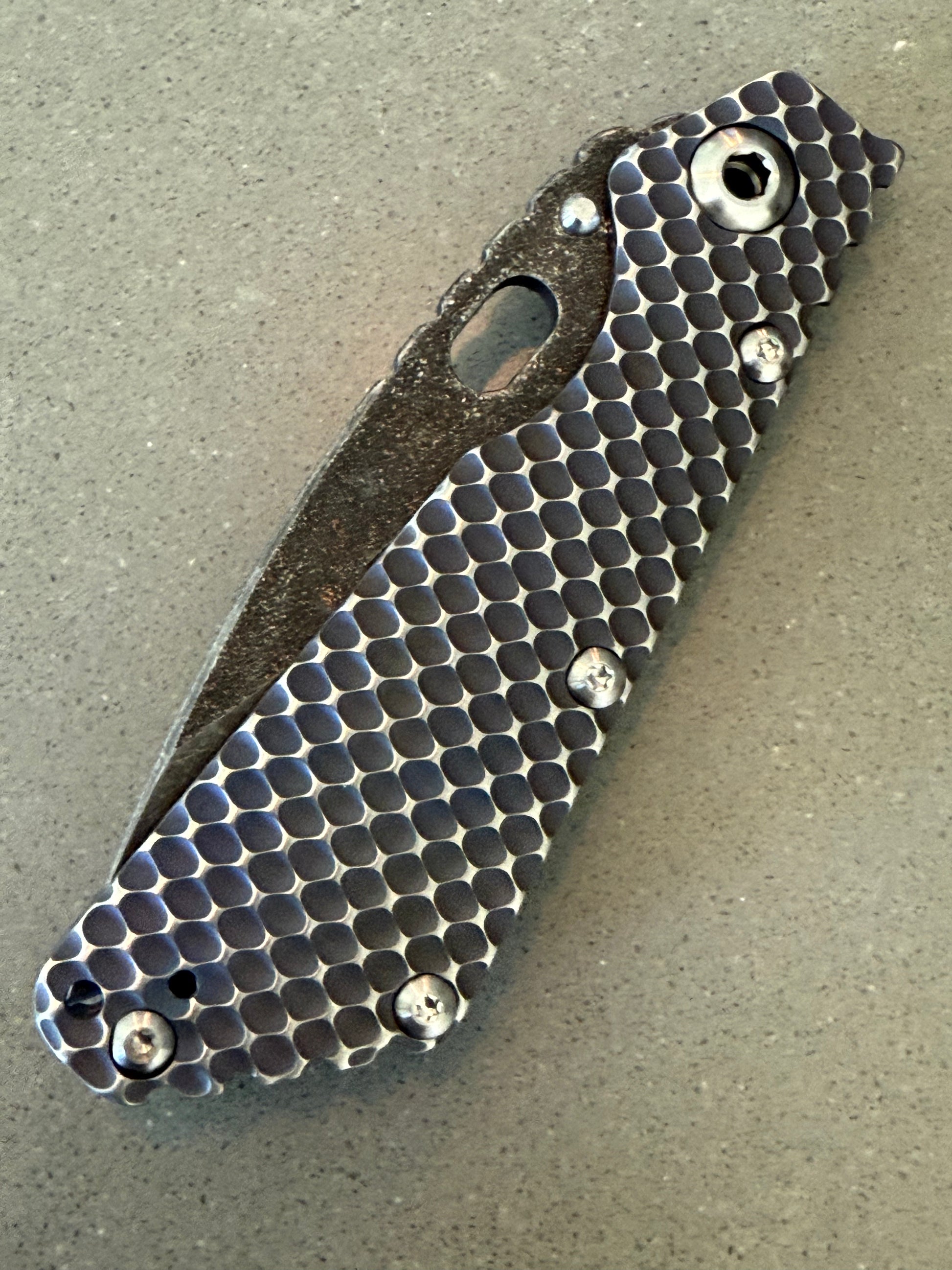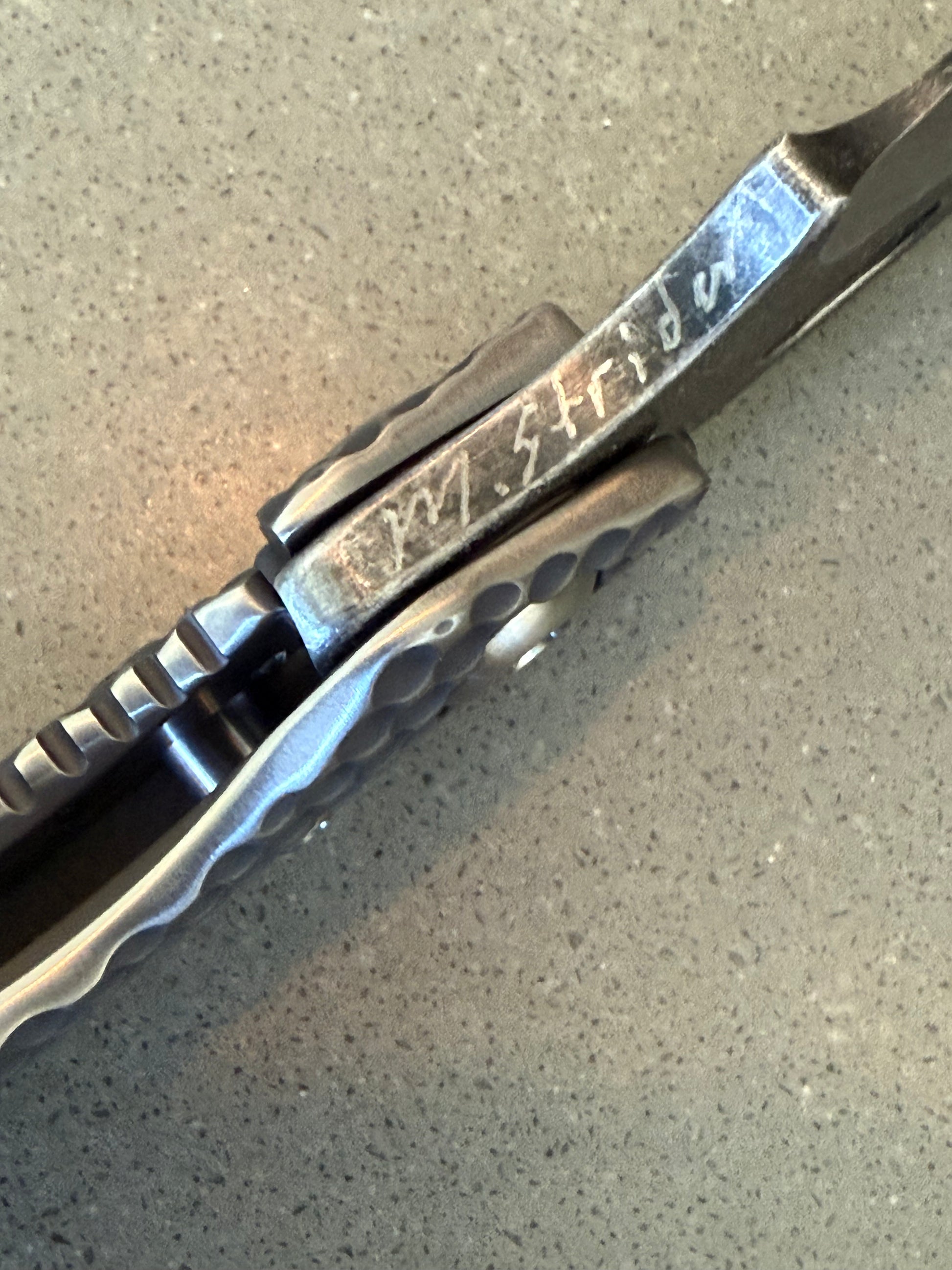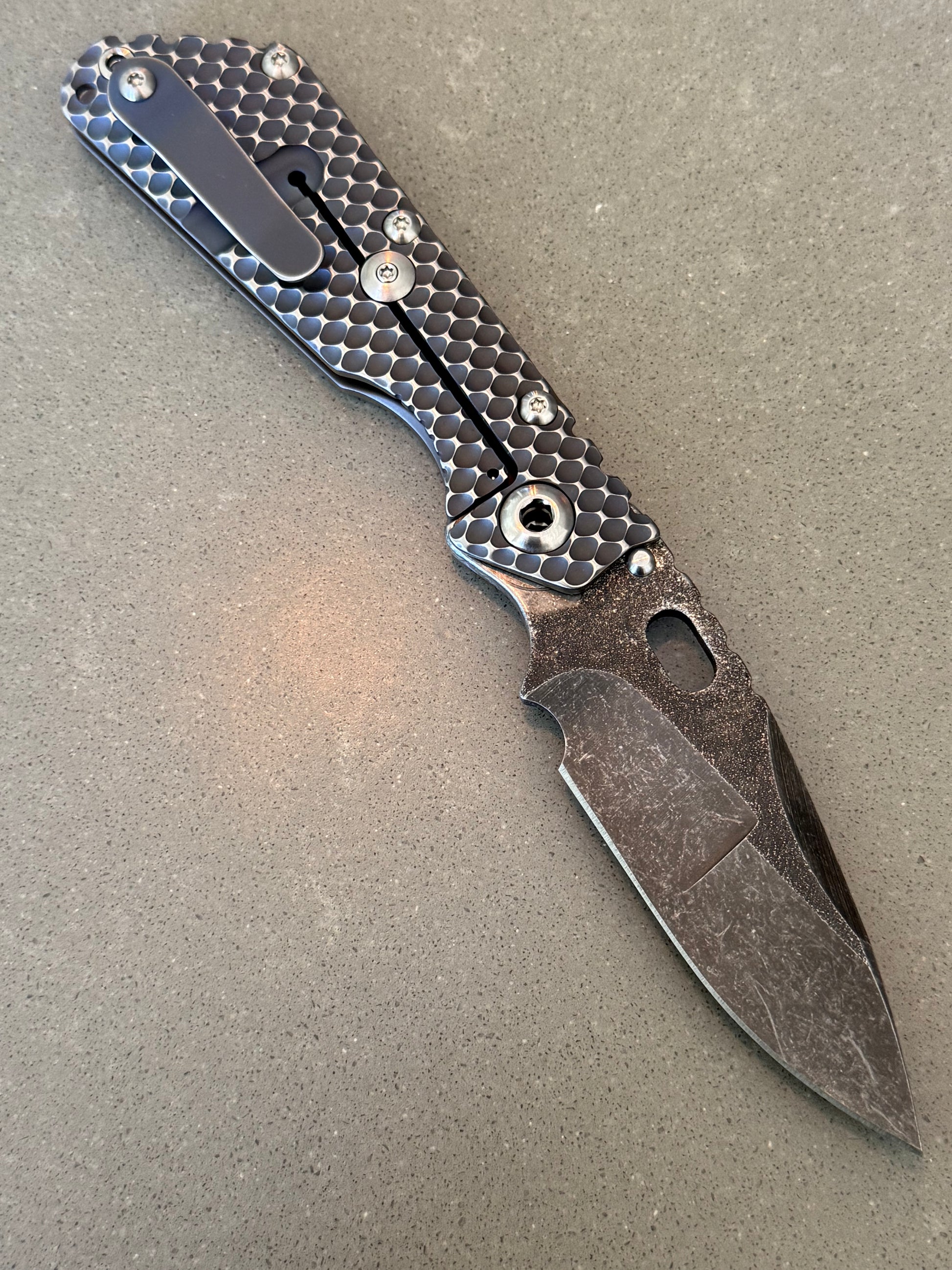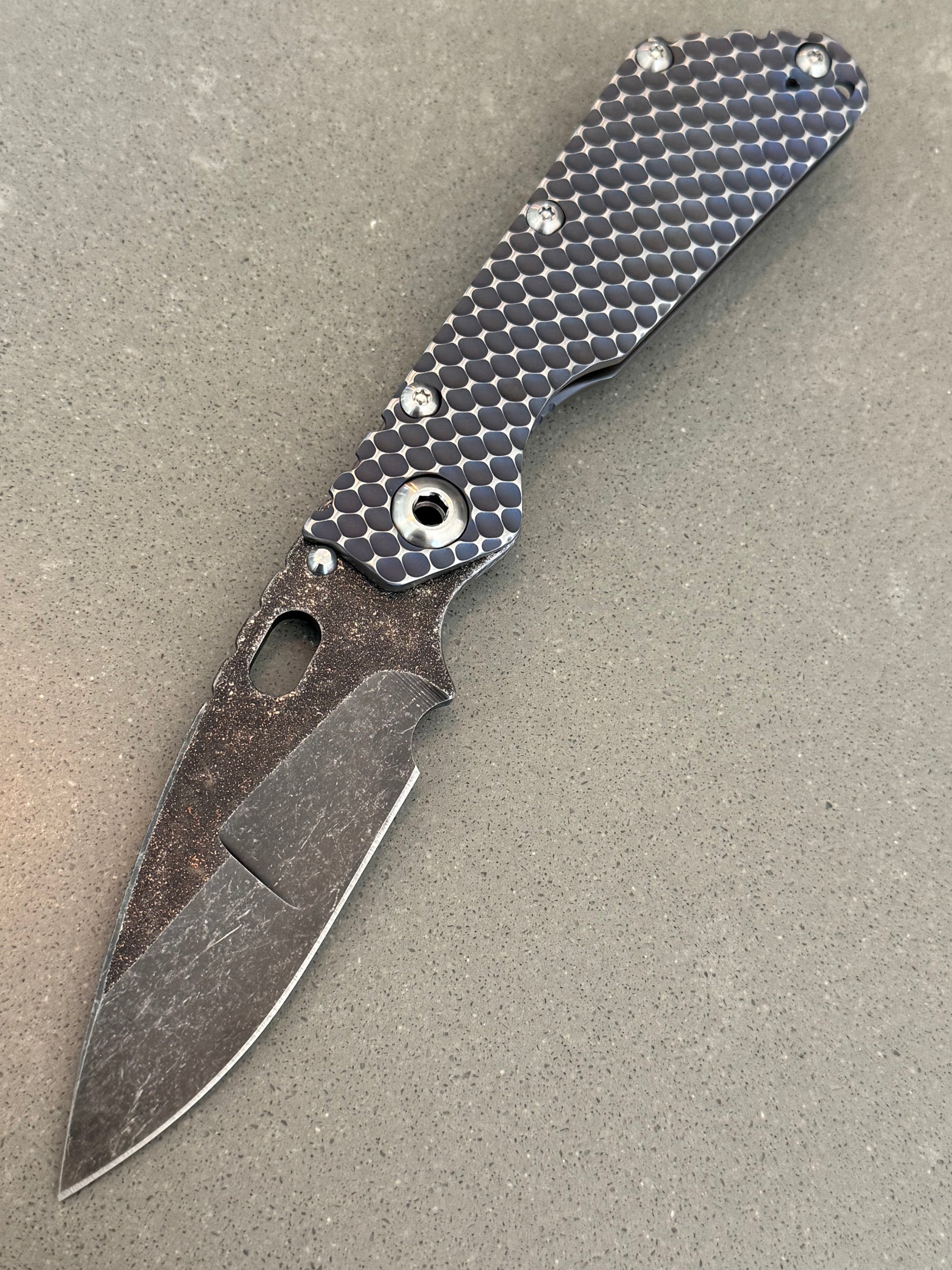 Mick Strider custom double gunner grip SMF. The blade is magnacut and features a nightmare ground blade that has been acid washed and has magma and copper infused on the blade. Mick's signature is shown on the underside of the choil . The Titanium frame on this Mick Strider Tactical Knife has been heat colored. We have a couple different variations of this if you're interested. Please message us for a cash discount.