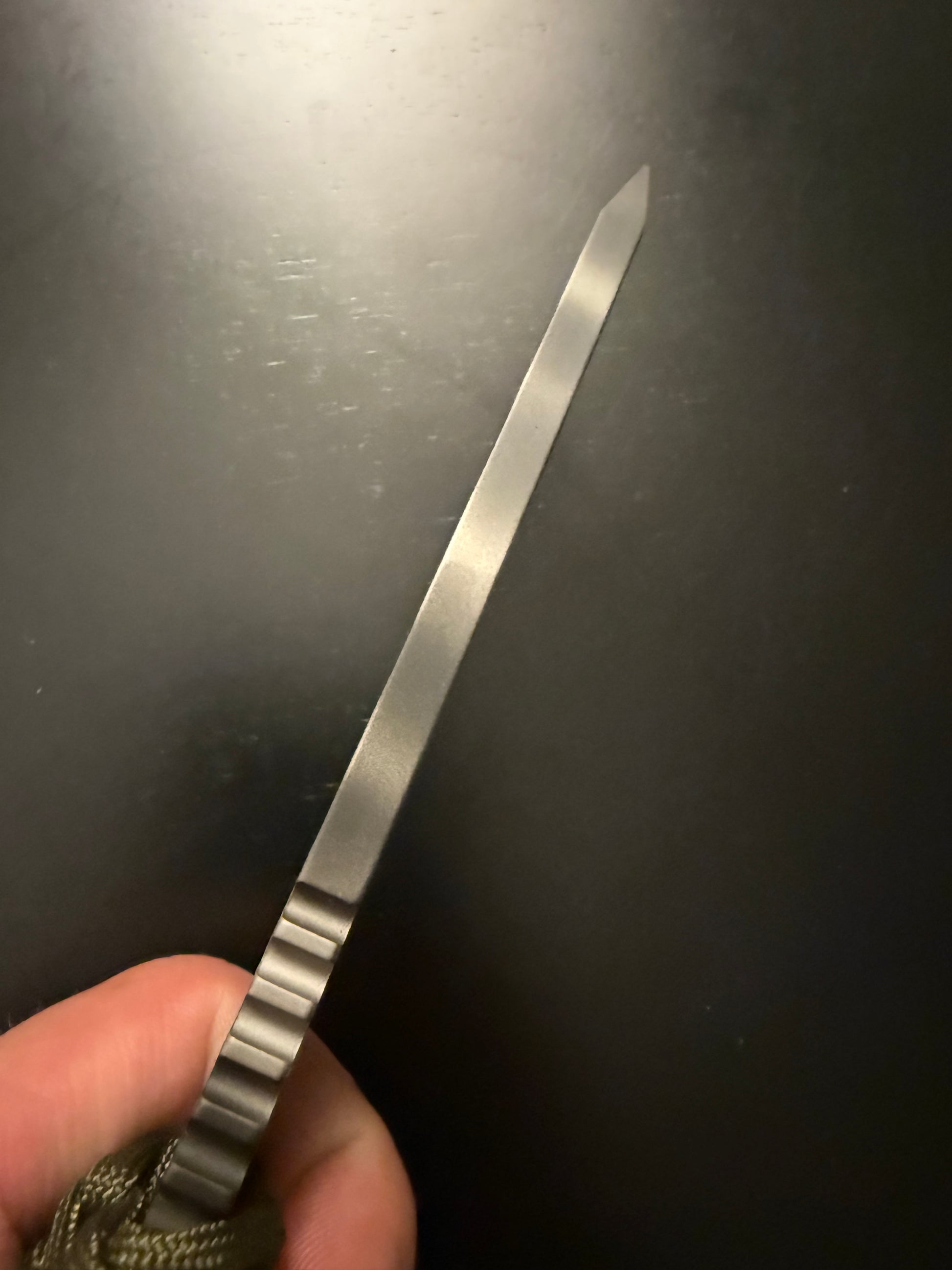 This DB-L fixed blade has a tiger stripe finished CPM S30V tanto blade, multi-ground with a flat, razor sharp edge. The front tang is marked "M. STRIDER" and the back has the FWP logo. Full tang construction makes this knife very solid. Handle is OD Green paracord wrapped and features jimping on the thumb ramp. Includes heavy duty Kydex sheath.